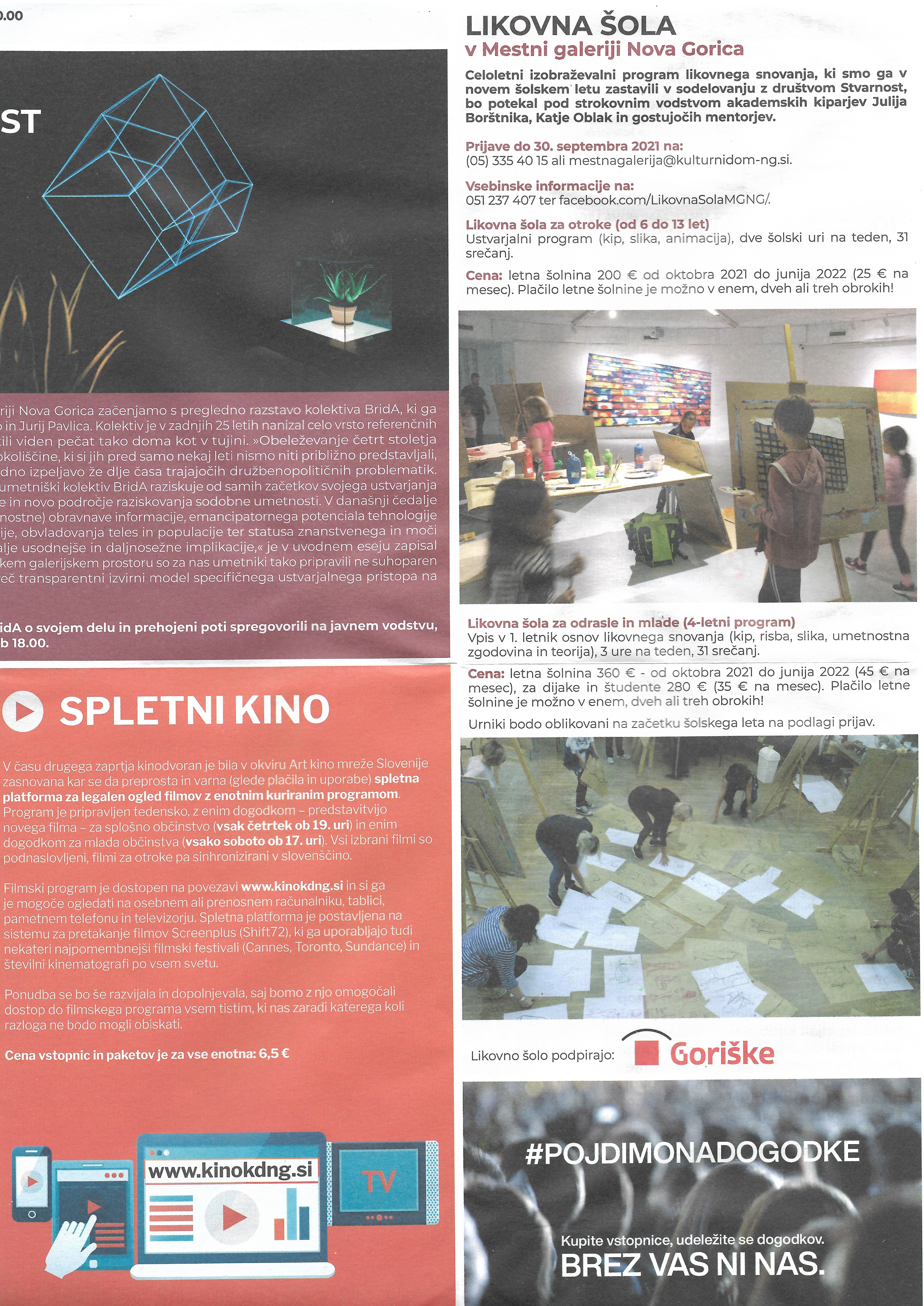 Cultural Center Nova Gorica announcement for September 2021; invitation to enroll in the Art School for the year 2021-2022. |